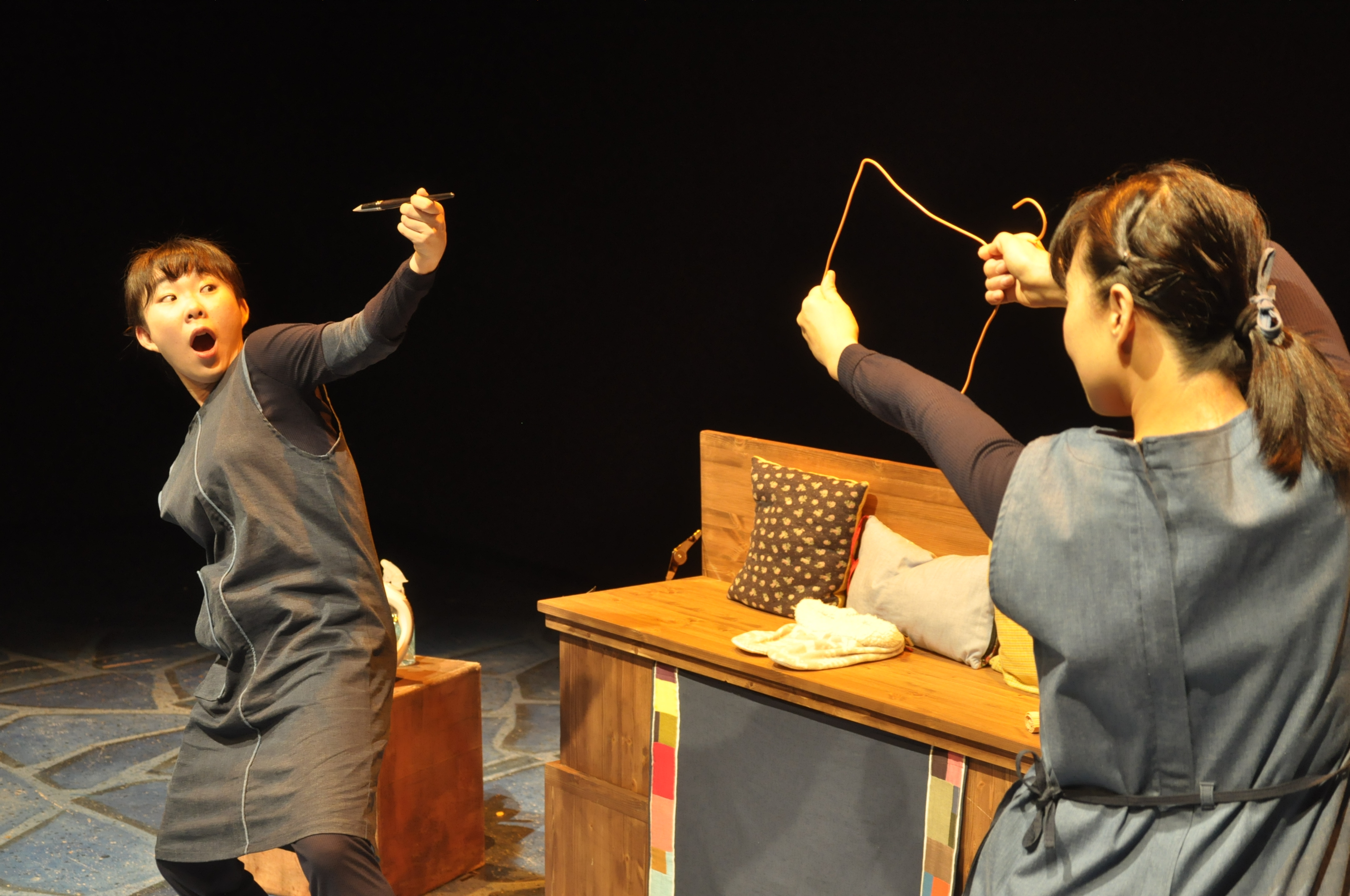 이야기꾼 ‘오묘’와 ‘반디’가 연습실에서 공연 연습에 한창인데요. 오잉? 가만 보니까 공연 연습이 아니라 어째 두 이야기꾼이 주방용품을 가지고 노는 것 같습니다!? 그도 그럴 것이 한 이야기꾼은 손에 감자 깎는 칼을 갖고 있고요. 한 이야기꾼은 드라이버를 갖고서 칼싸움을 하네요. (이건 속된 말로 ‘농땡이?’) 이런! 이번에는 한술 더 떠서 망치, 드라이버... 아예 공구통을 갖다 놓고 본격적으로 놀기 시작하는 군요. ^^